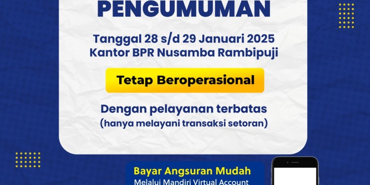 Pengumuman untuk tanggal 28 s/d 29 Januari 2025 Kantor BPR Nusamba Rambipuji tetap beroperasional d...