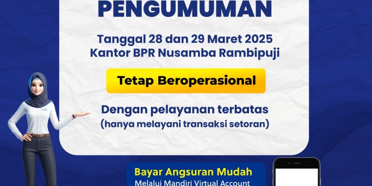 Pengumuman Operasional Kantor BPR Nusamba Rambipuji untuk tanggal 28 dan 29 Maret 2025 Tetap Beroper...