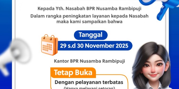 Pengumuman dalam rangka peningkatan layanan kepada Nasabah maka kami sampaikan bahwa tanggal 29 s.d. 30 November 2025 Kantor BPR Nusamba Rambipuji Tetap Buka dengan Pelayanan Terbatas (Hanya melayani setoran)