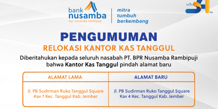 Diberitahukan kepada seluruh nasabah PT. BPR Nusamba Rambipuji bahwa Kantor Kas Tanggul pindah alama...