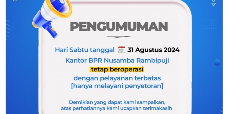 Pengumuman Jam Operasional BPR Nusamba Rambipuji untuk tanggal 31 Agustus 2024